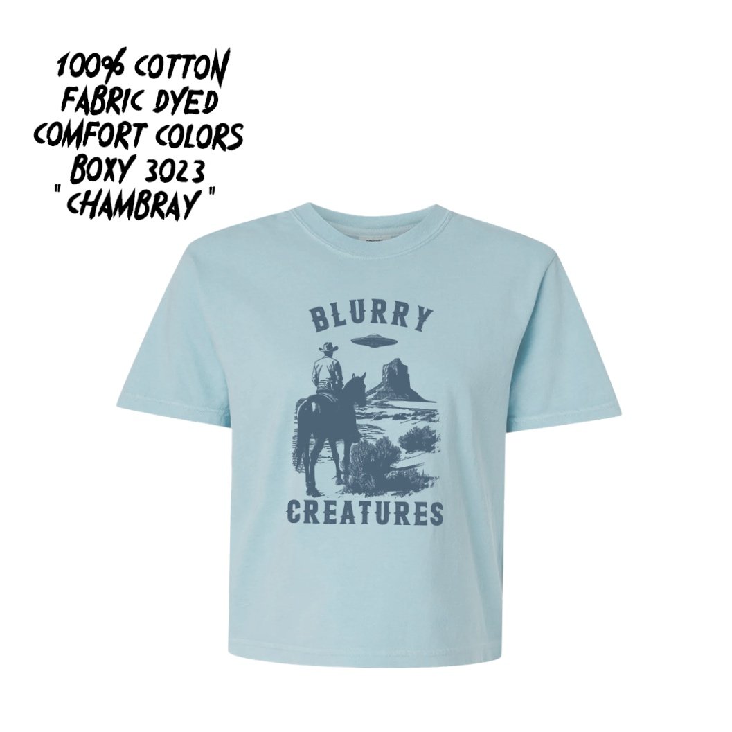 Available in 'Butter' on a unisex fabric-dyed 100% cotton comfort color blank, a super soft unisex 60/40 Next Level 'cream' blank, and a 100% cotton women's boxy fabric dyed 'chambray' comfort color blank.