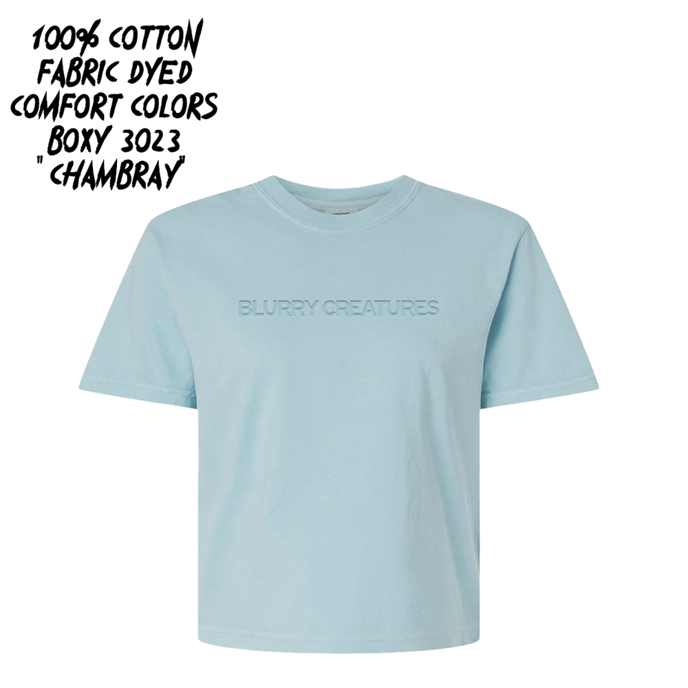 Available in 'ivory', 'black', 'denim', and 'wine' colors on a unisex fabric-dyed 100% cotton comfort color blank, and a 100% cotton women's boxy fabric dyed in 'black' and 'chambray' comfort color blanks.