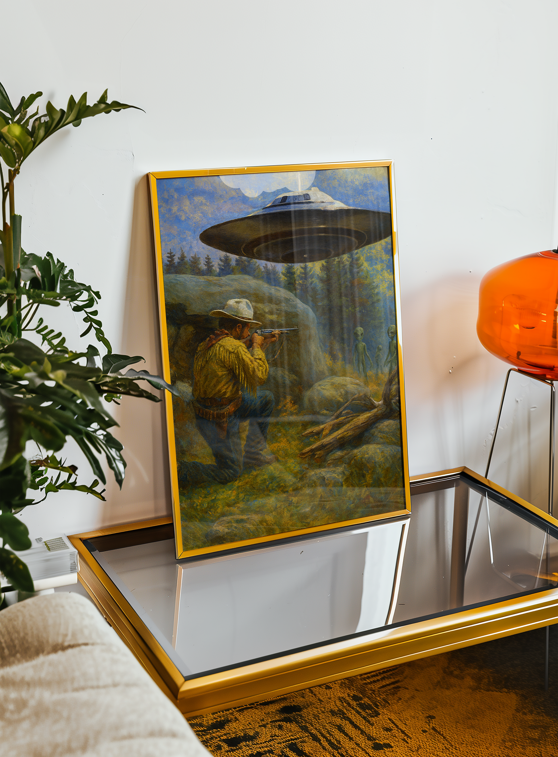 Where the wild west meets the final frontier! In this action-packed scene, a rugged cowboy takes aim at an extraterrestrial encounter straight out of a sci-fi fantasy.